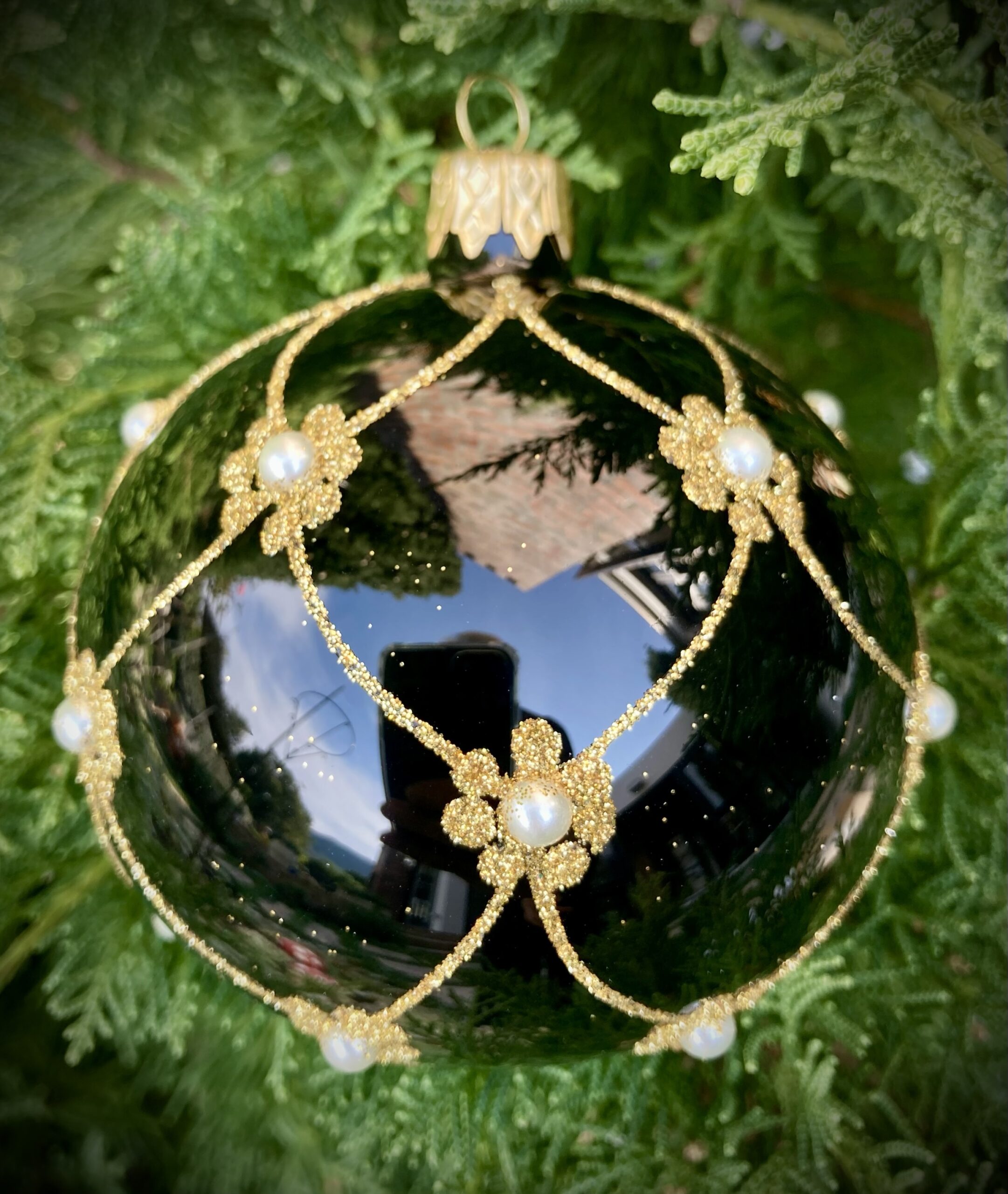 - Mouth blown glass ornament in a gloss black with gold glitter and glass pearls
