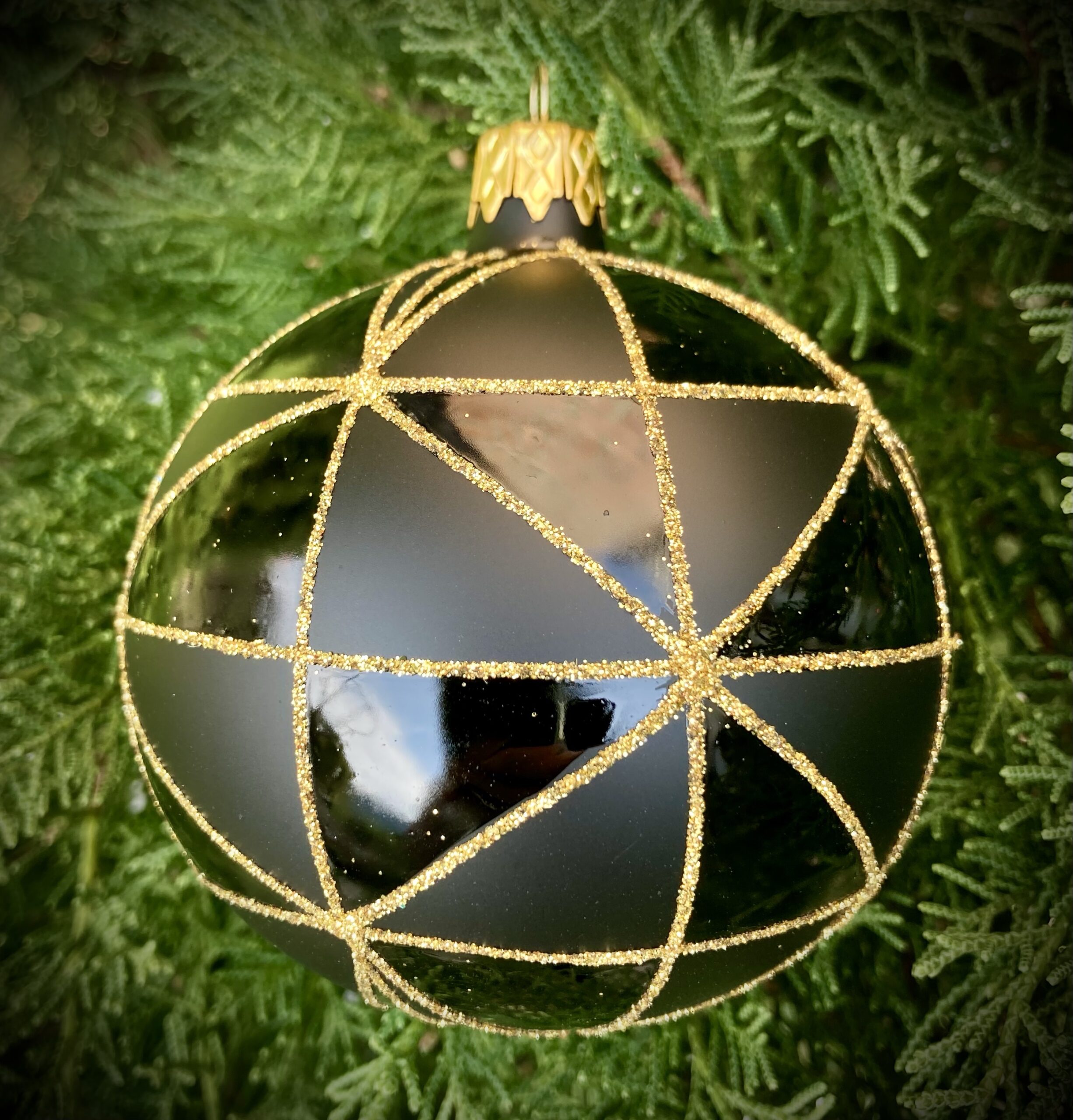 - Mouth blown glass ornament in an alternating gloss and matte black with gold glitter design
