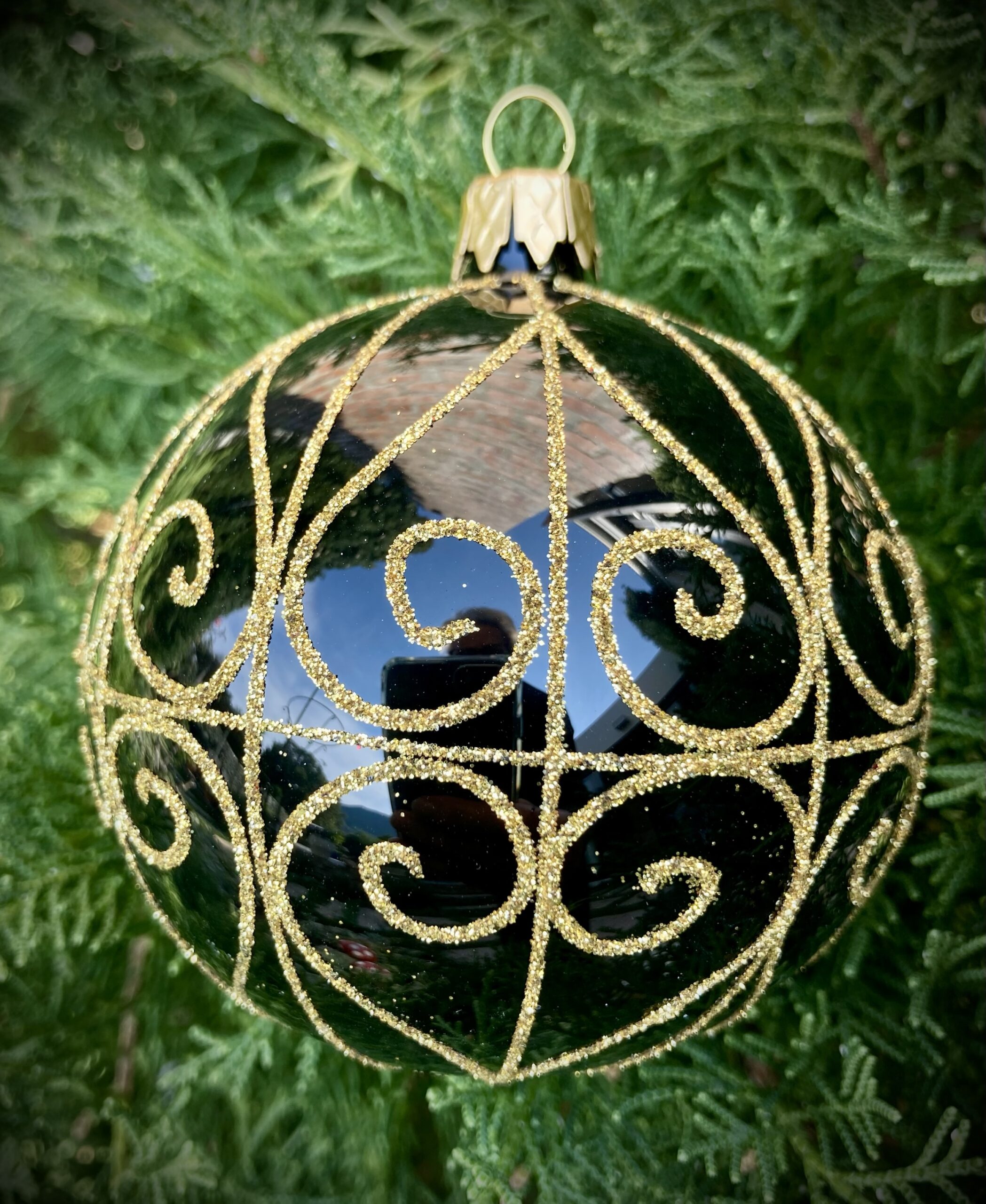- Mouth blown glass ornament in a gloss black with gold glitter design