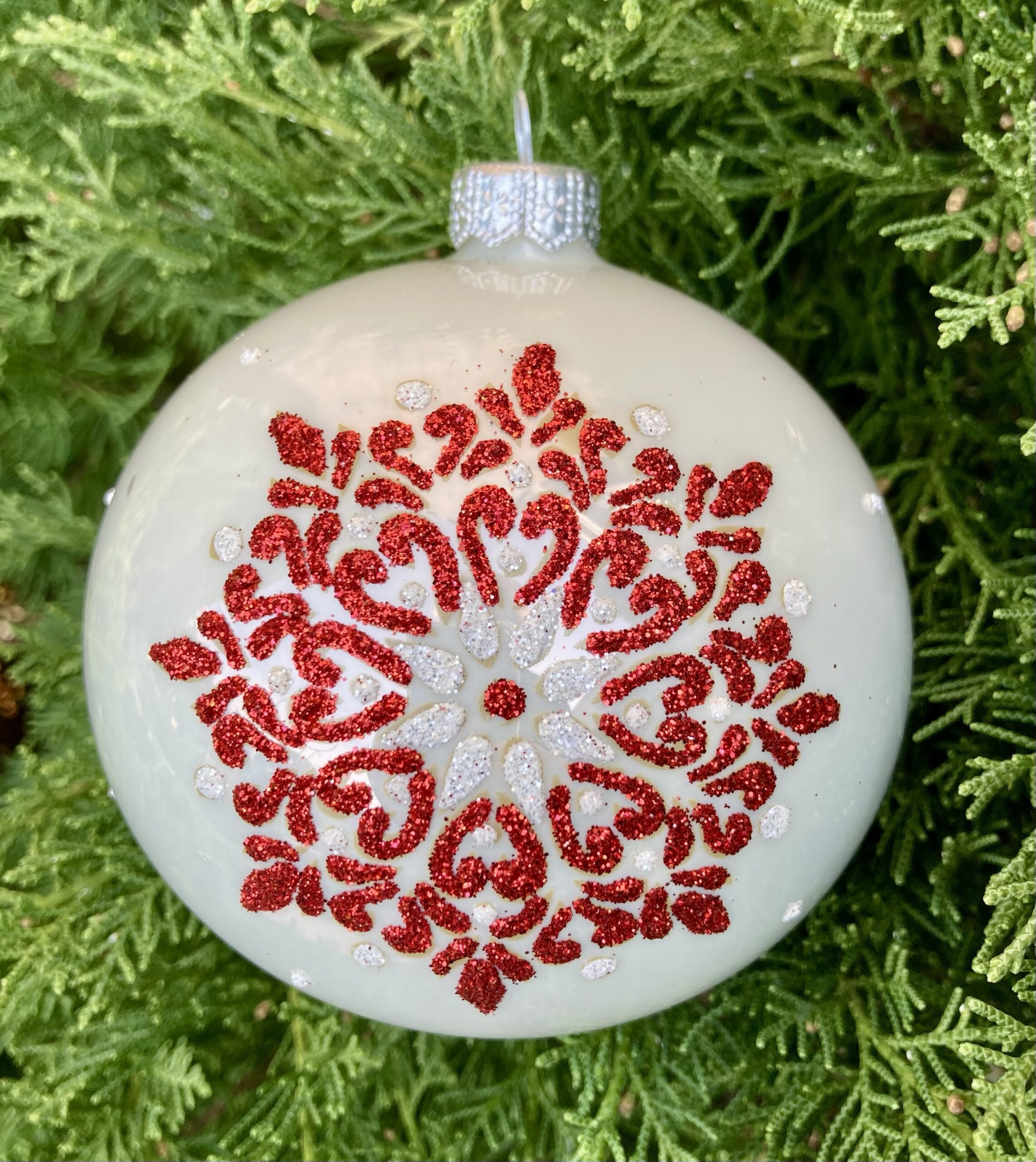 - Gloss white mouth blown glass ornament with red glitter snowflake