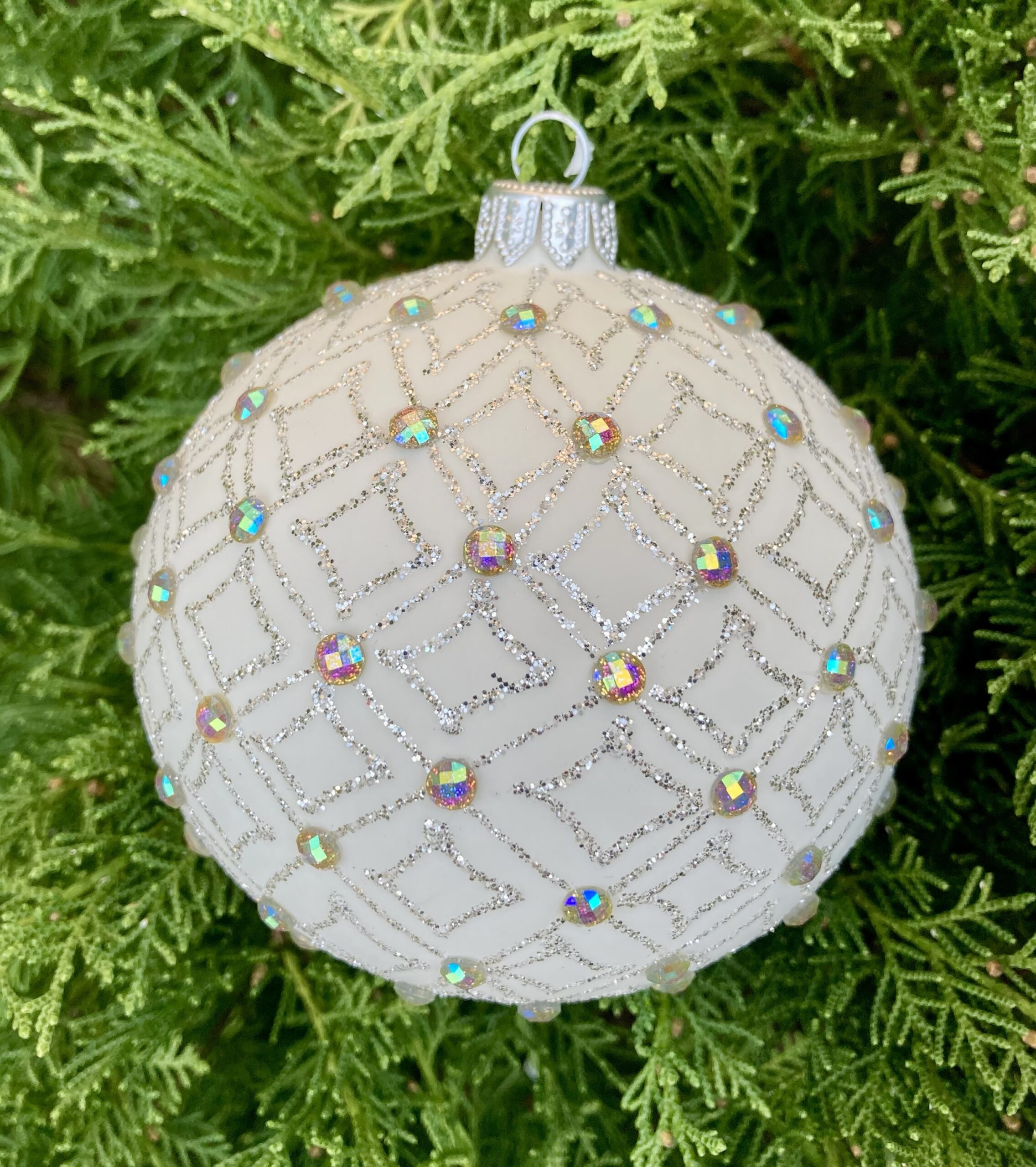 - Matte white mouth blown glass ornament embellished with silver glitter and rainbow crystals