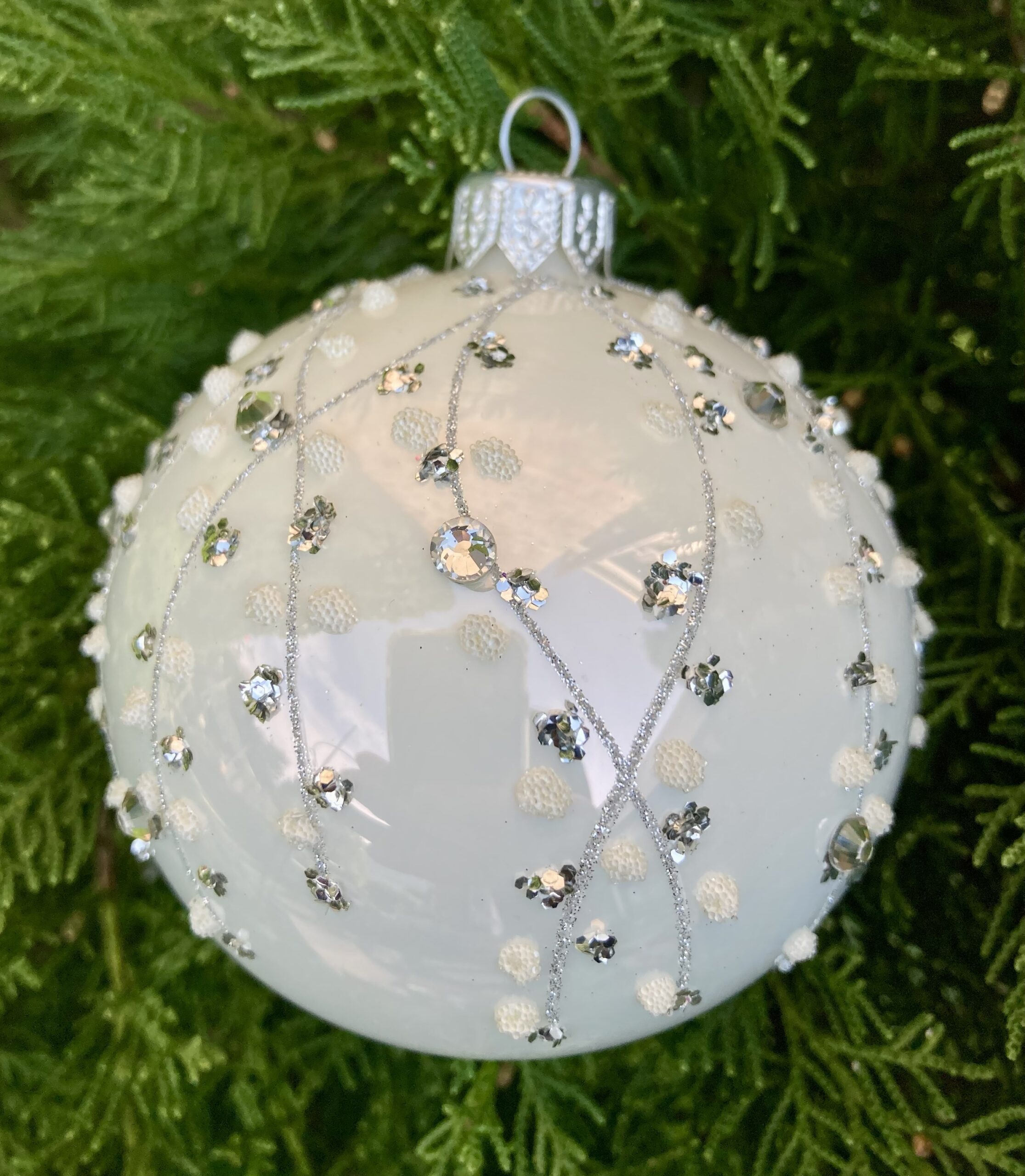 - Gloss white mouth blown glass decorated with silver glitter and crystals