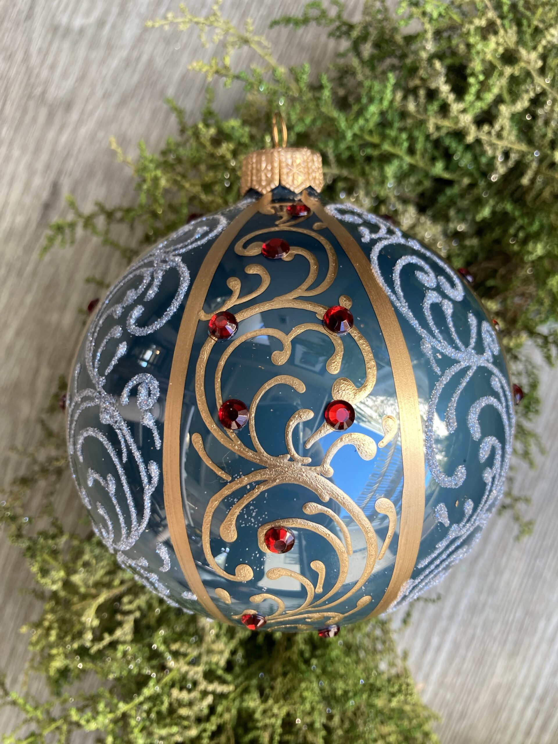 - Turquoise mouth blown glass ornament decorated with gold and red crystals