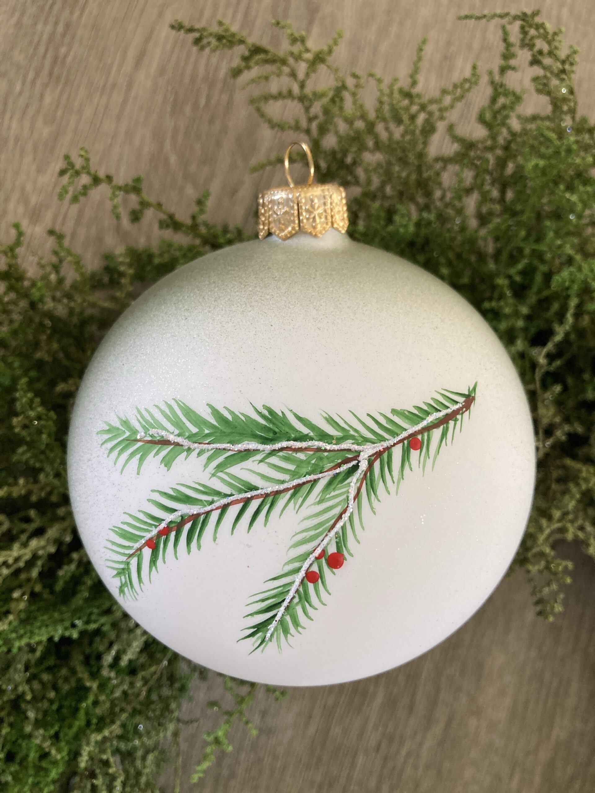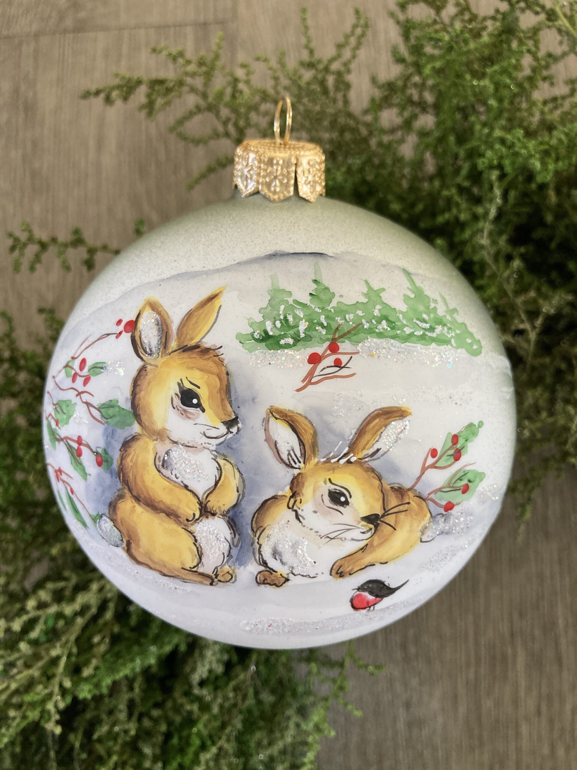 - Matte mouth blown glass with hand painted winter landscape with little hares