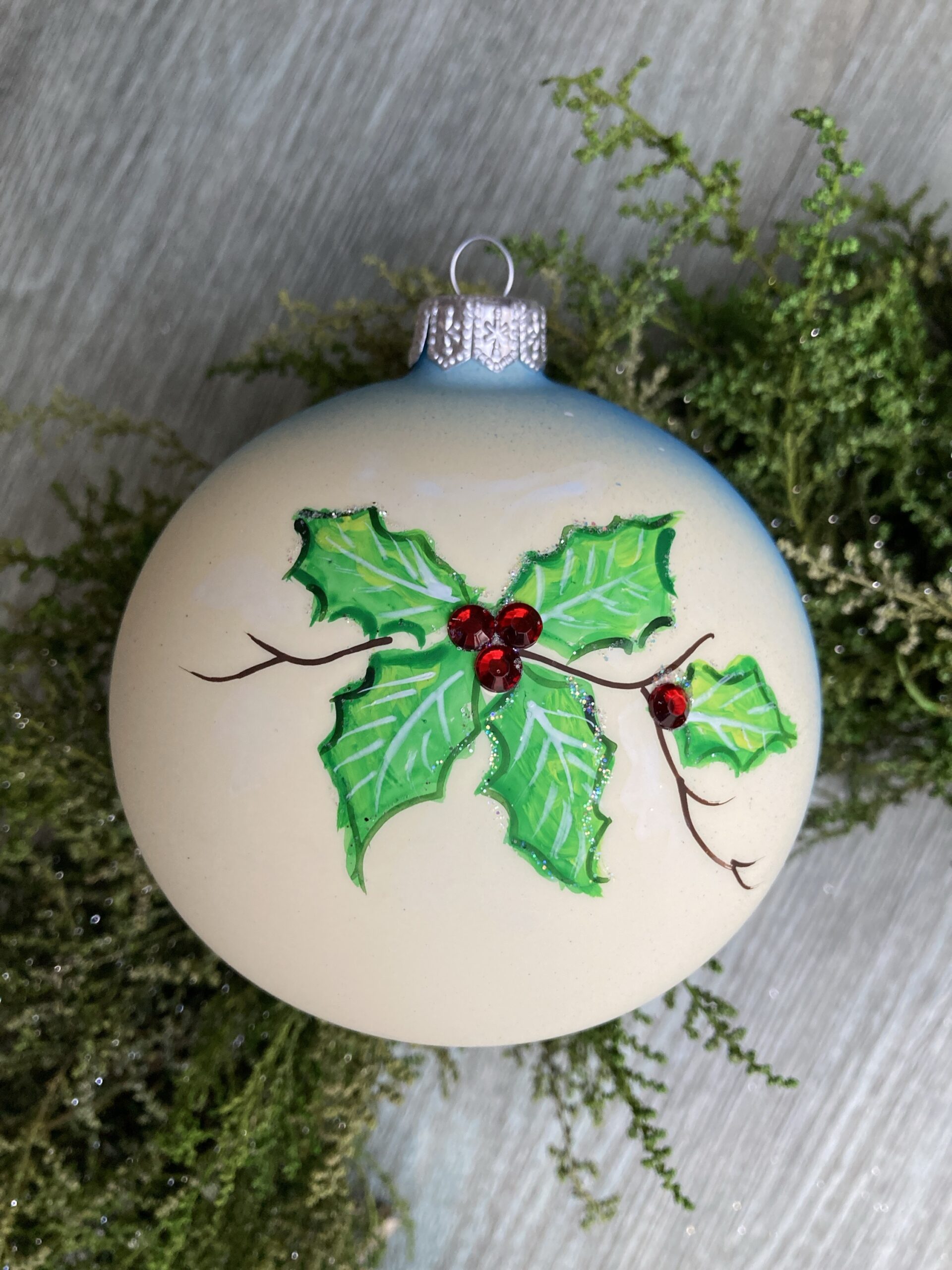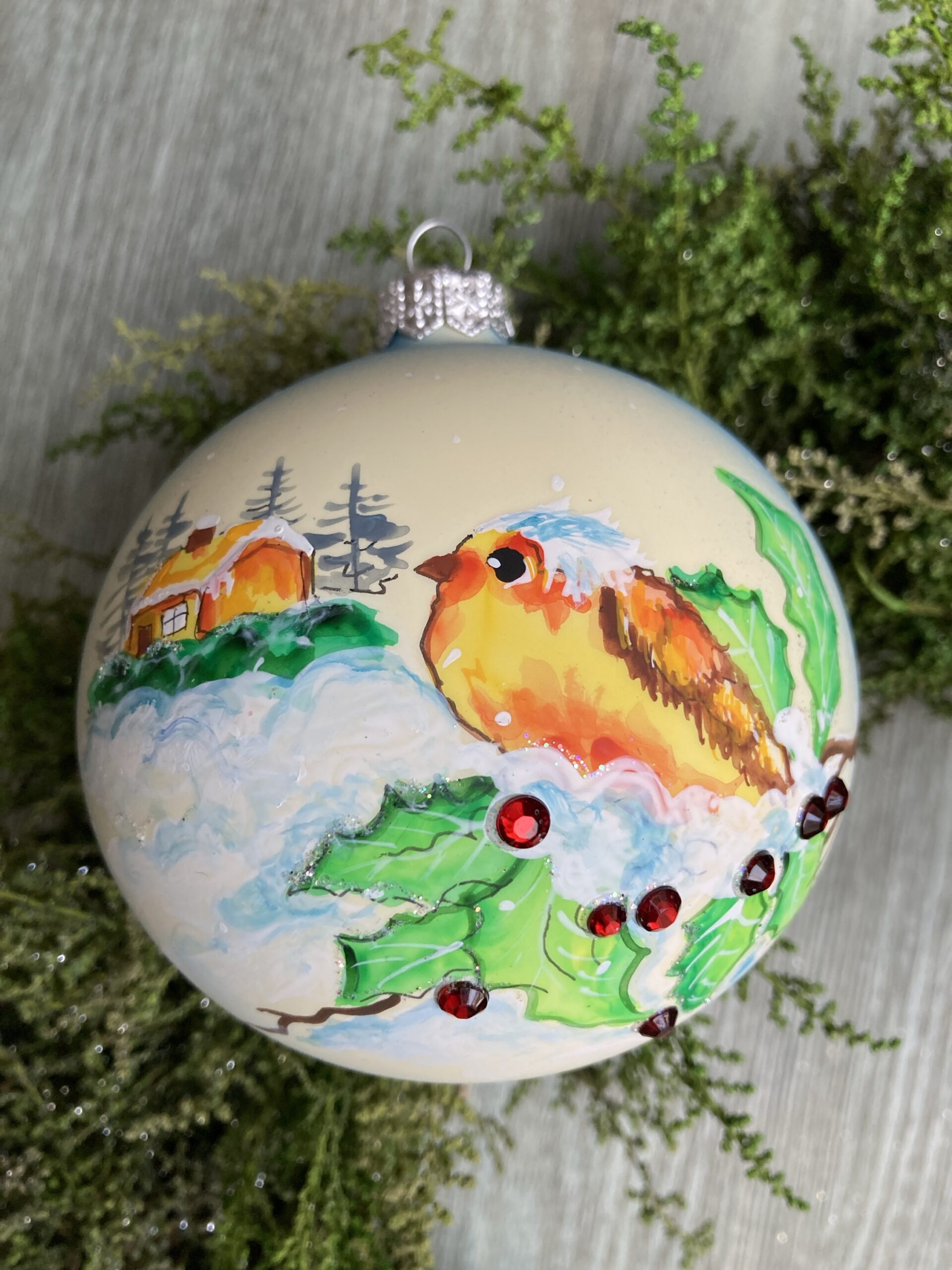 - Matte cream mouth blown glass with hand painted winter landscape with robins