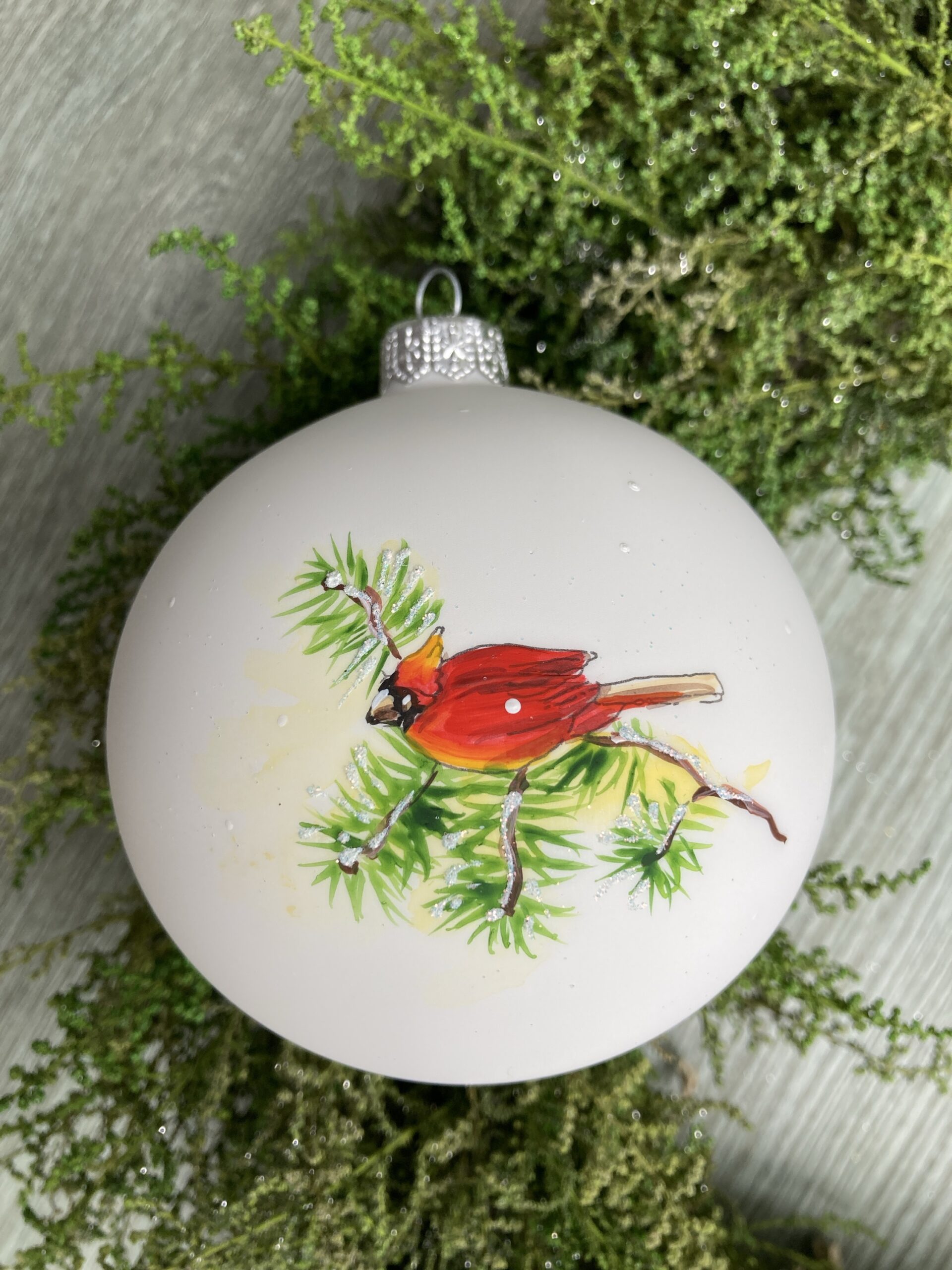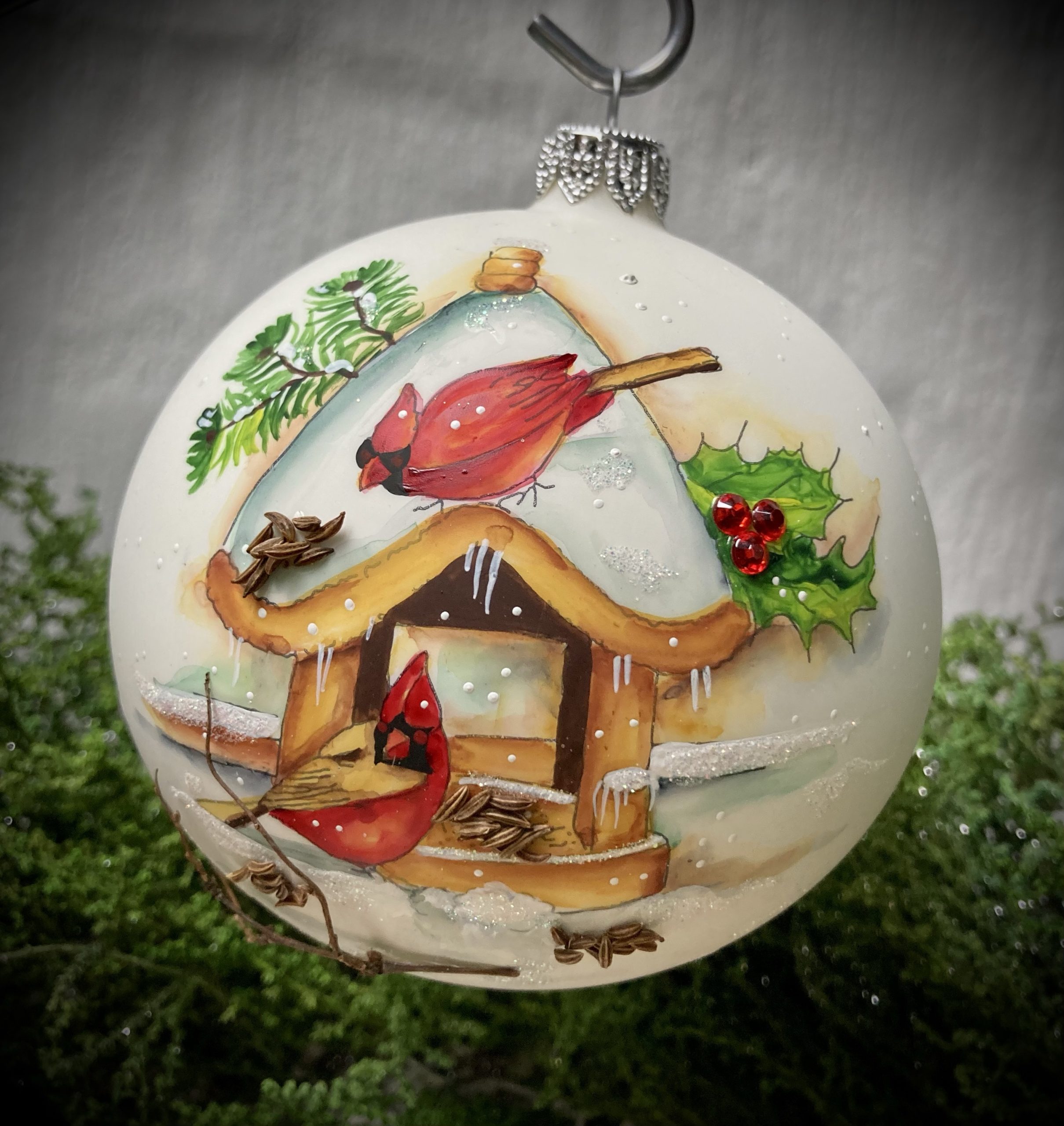 - Matte white mouth blown glass with hand painted scene of cardinals outside a cottage in the snow