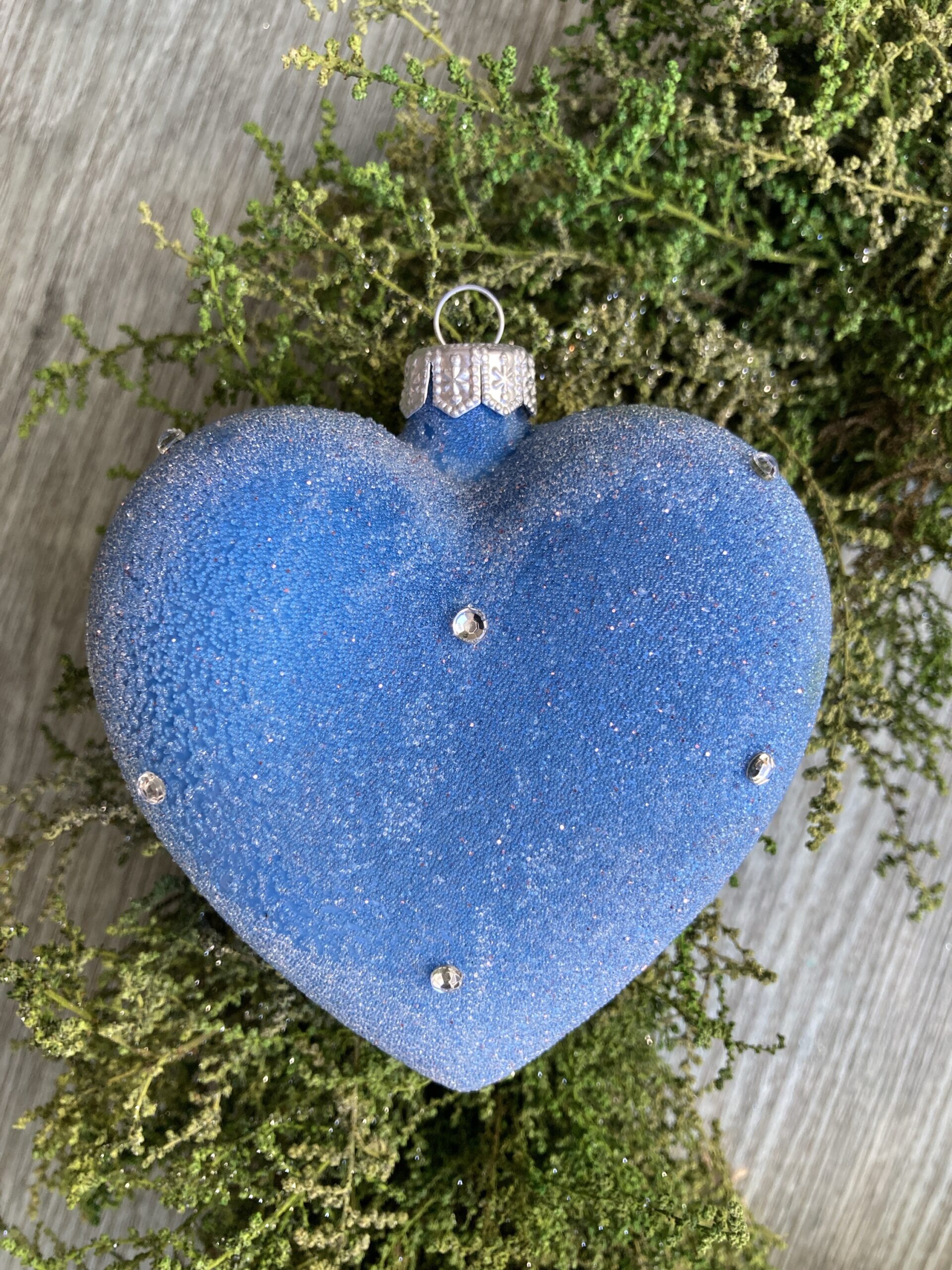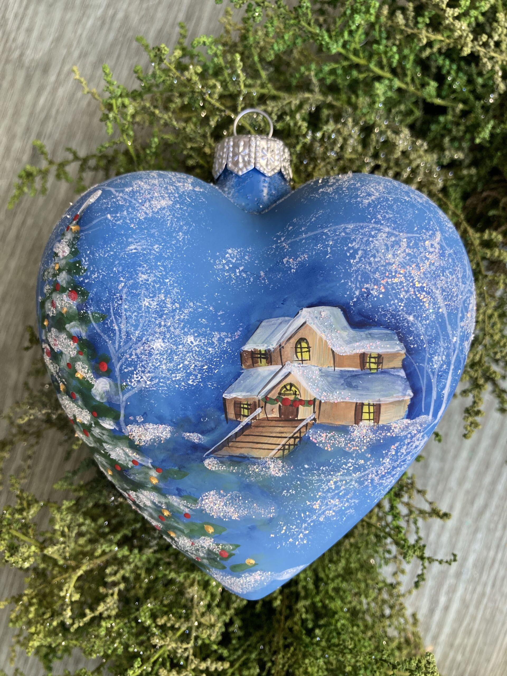- Moulded glass heart shaped ornament with hand painted winter scene on the front and glass glitter on the back