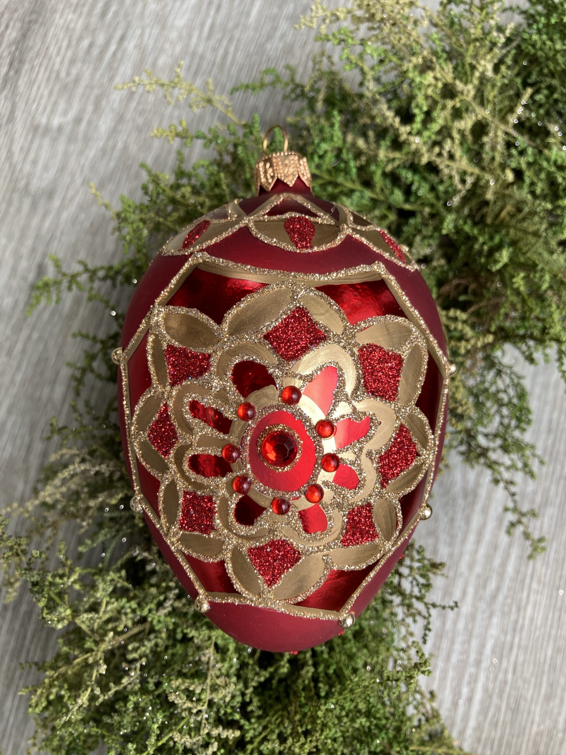 - Bright matte red moulded glass egg shaped ornament, inspired by P C Faberge, decorated with gold and red glitter and crystals