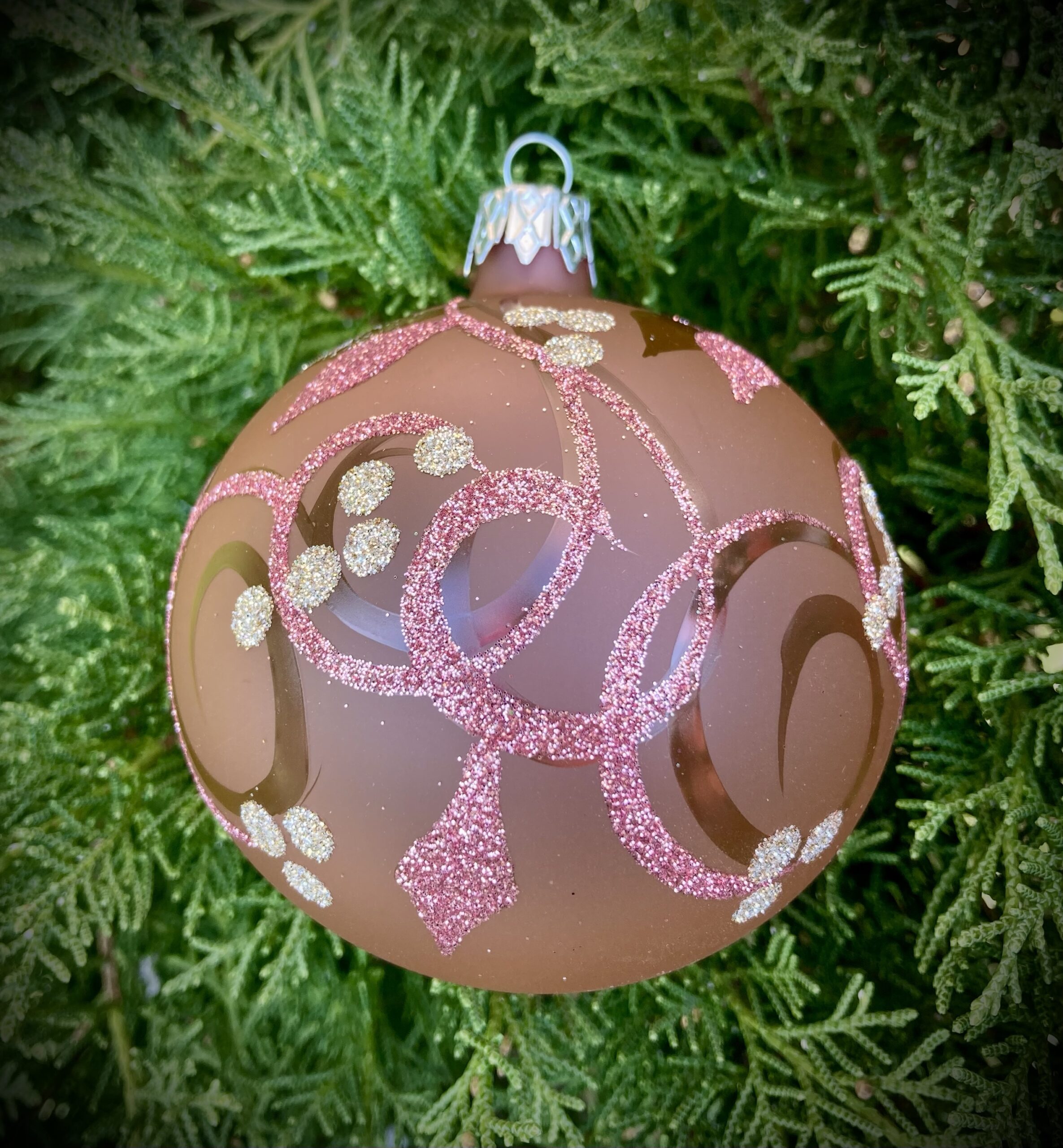 - Frosted pink mouth blown glass ornament decorated with pink and silver glitter