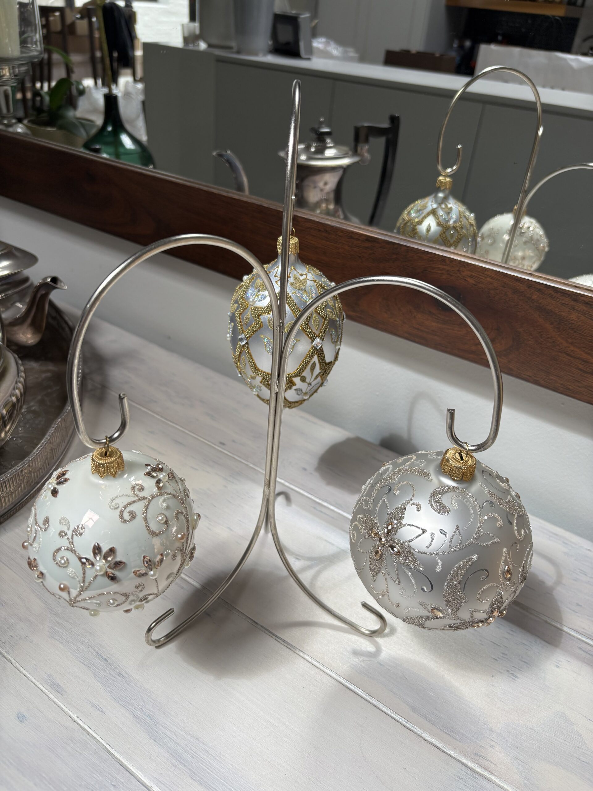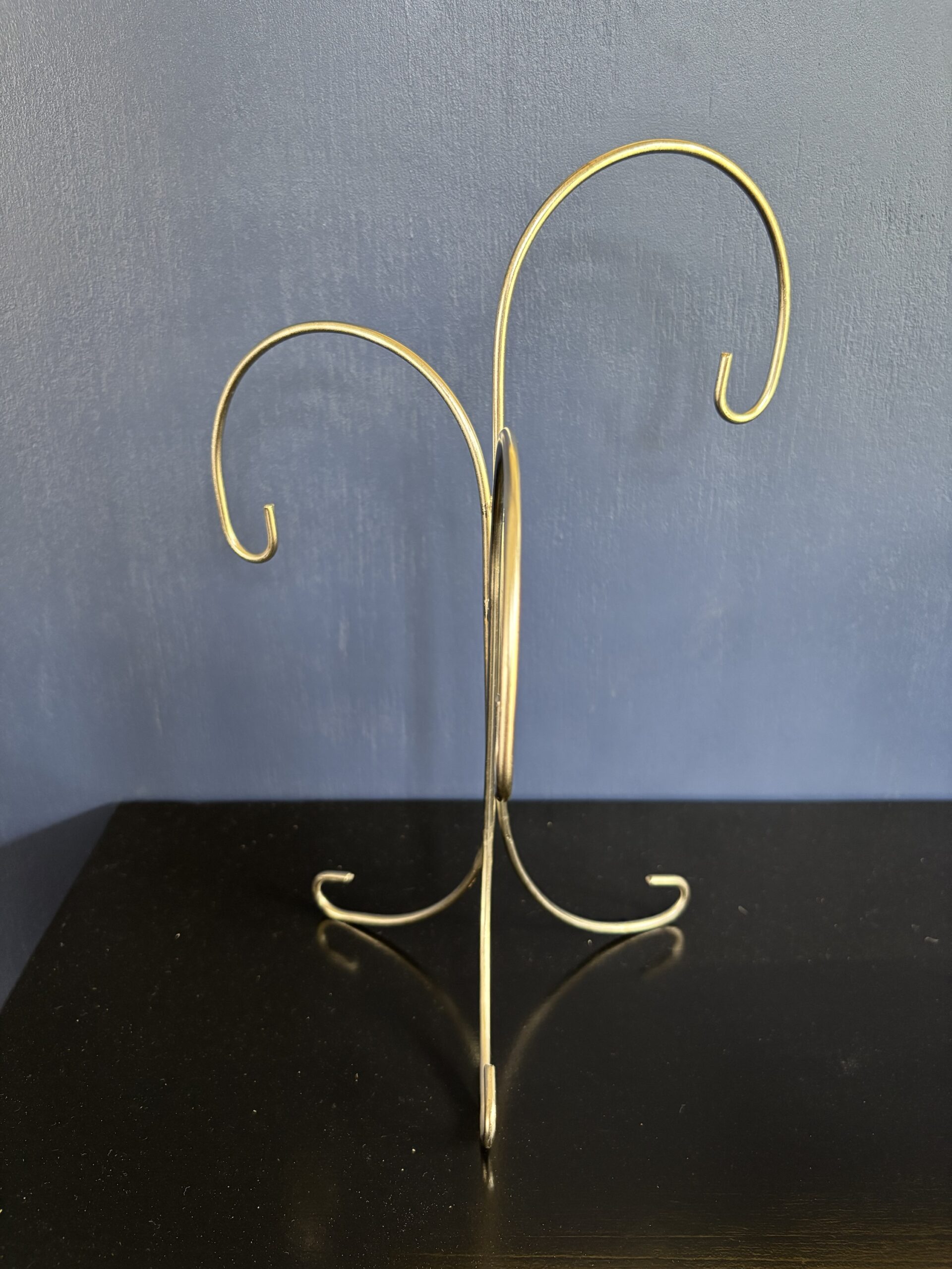 Metal stand in soft silver with three arms to hold ornaments.