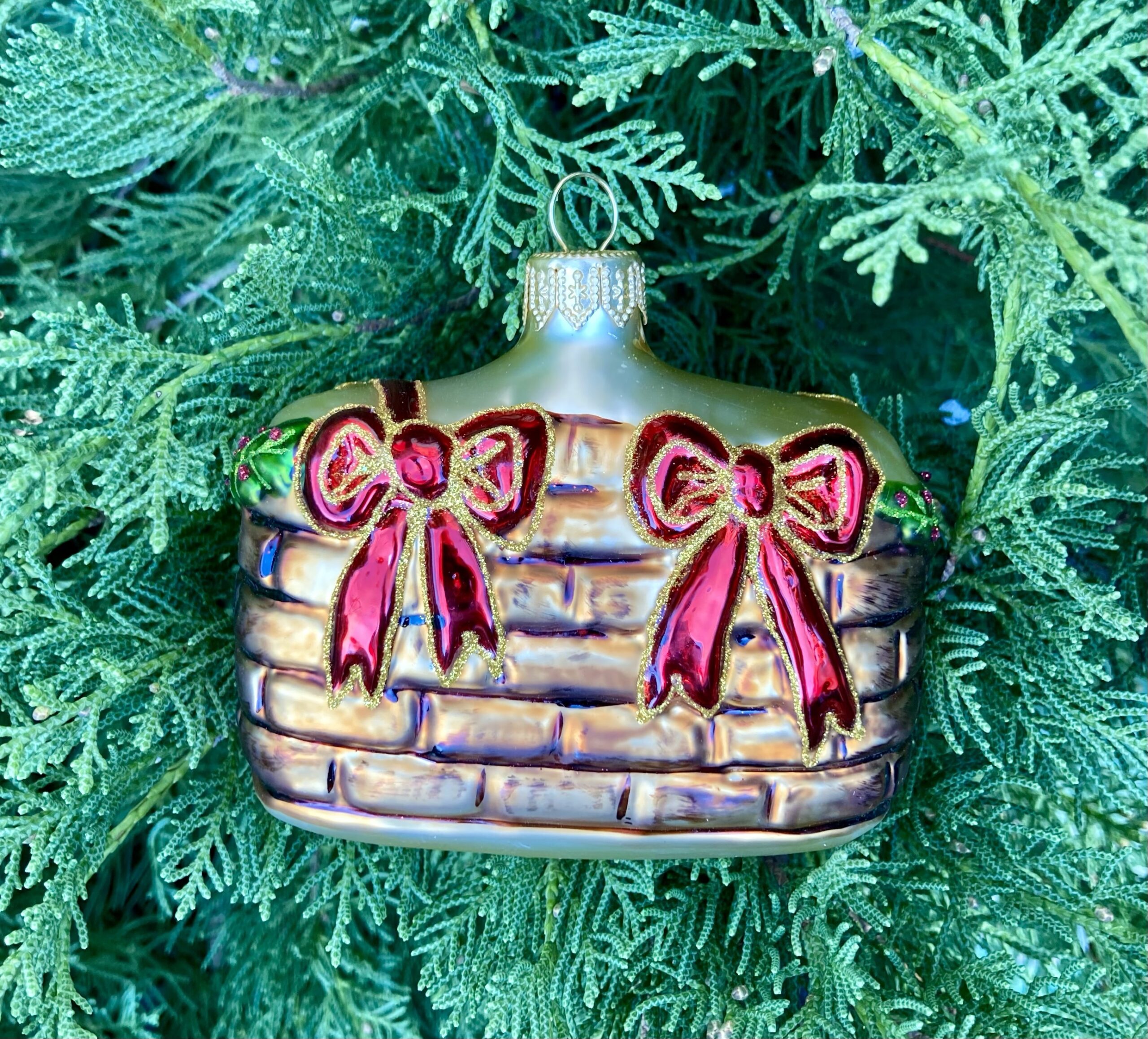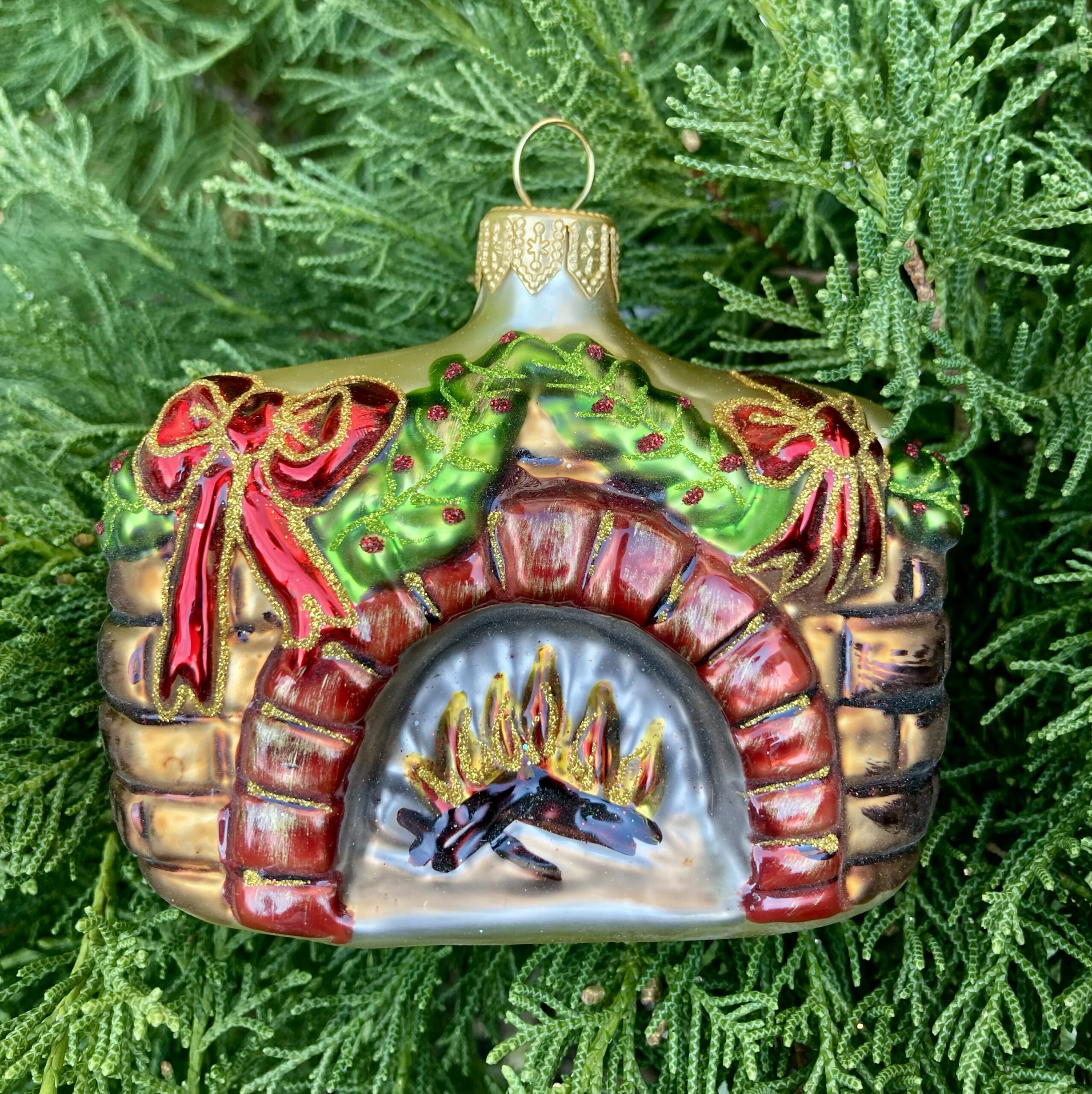 - Moulded glass ornament in the shape of a cosy Christmas fireplace