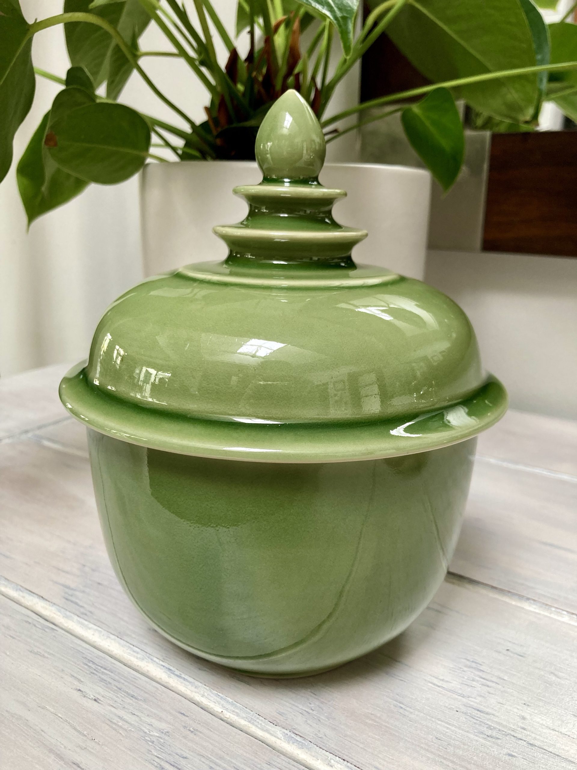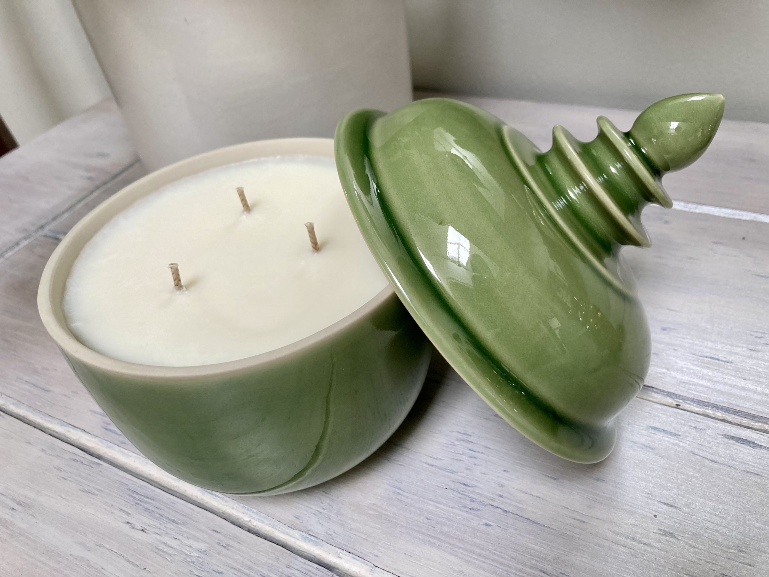 600gms pure soy wax hand poured into one of our exclusive range of handmade ceramics. This stunning pot is glossy Celadon green and is 170mm high and 145mm wide.