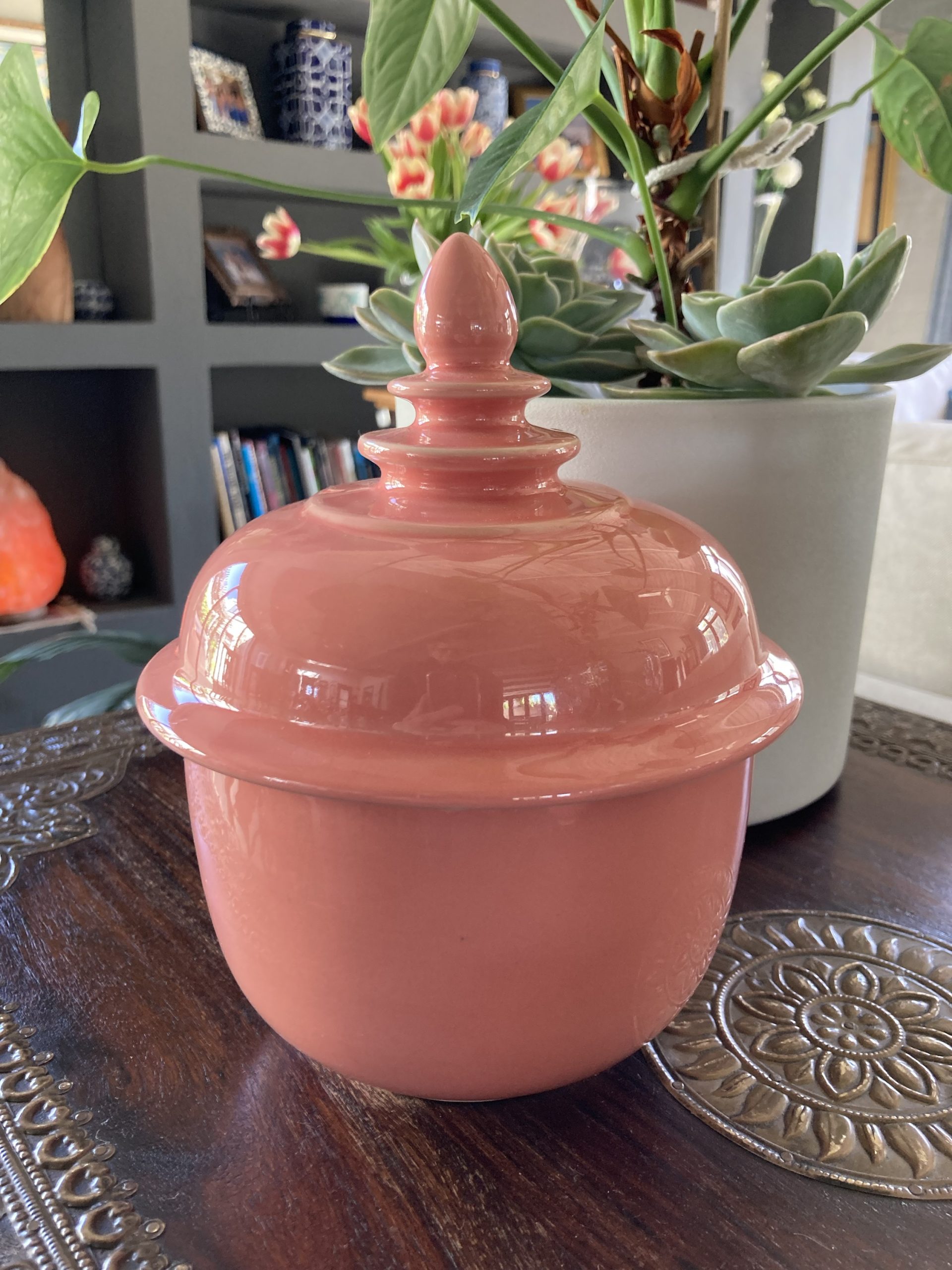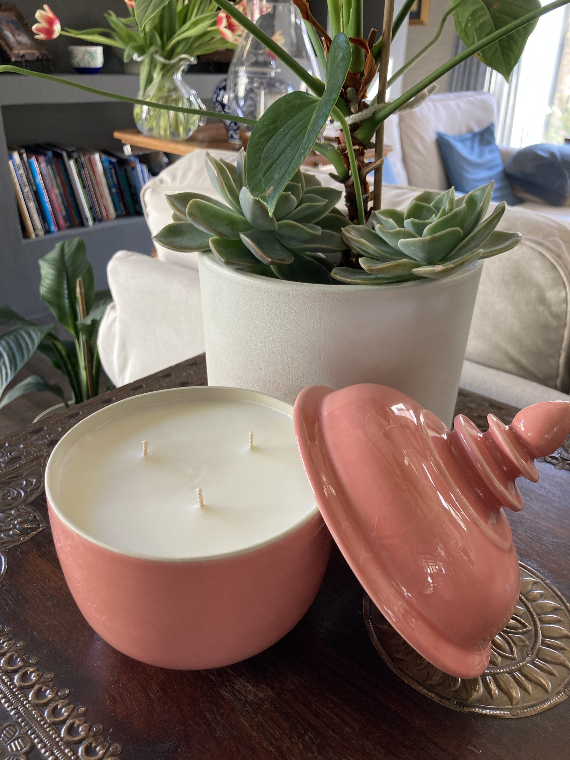 600gms pure soy wax hand poured into one of our exclusive range of handmade ceramics. This stunning pot is glossy salmon pink and is 170mm high and 145mm wide.