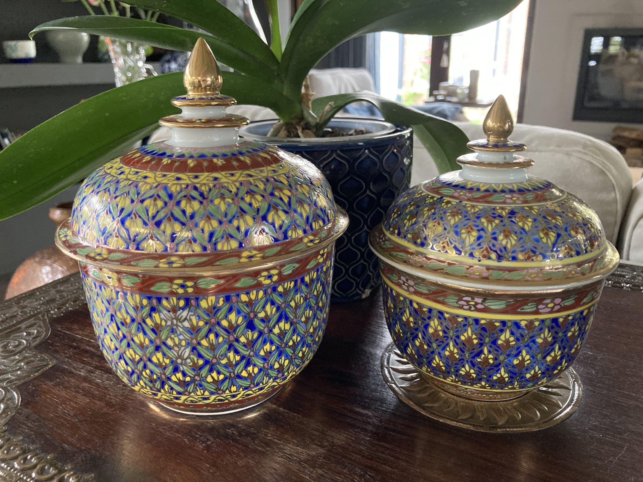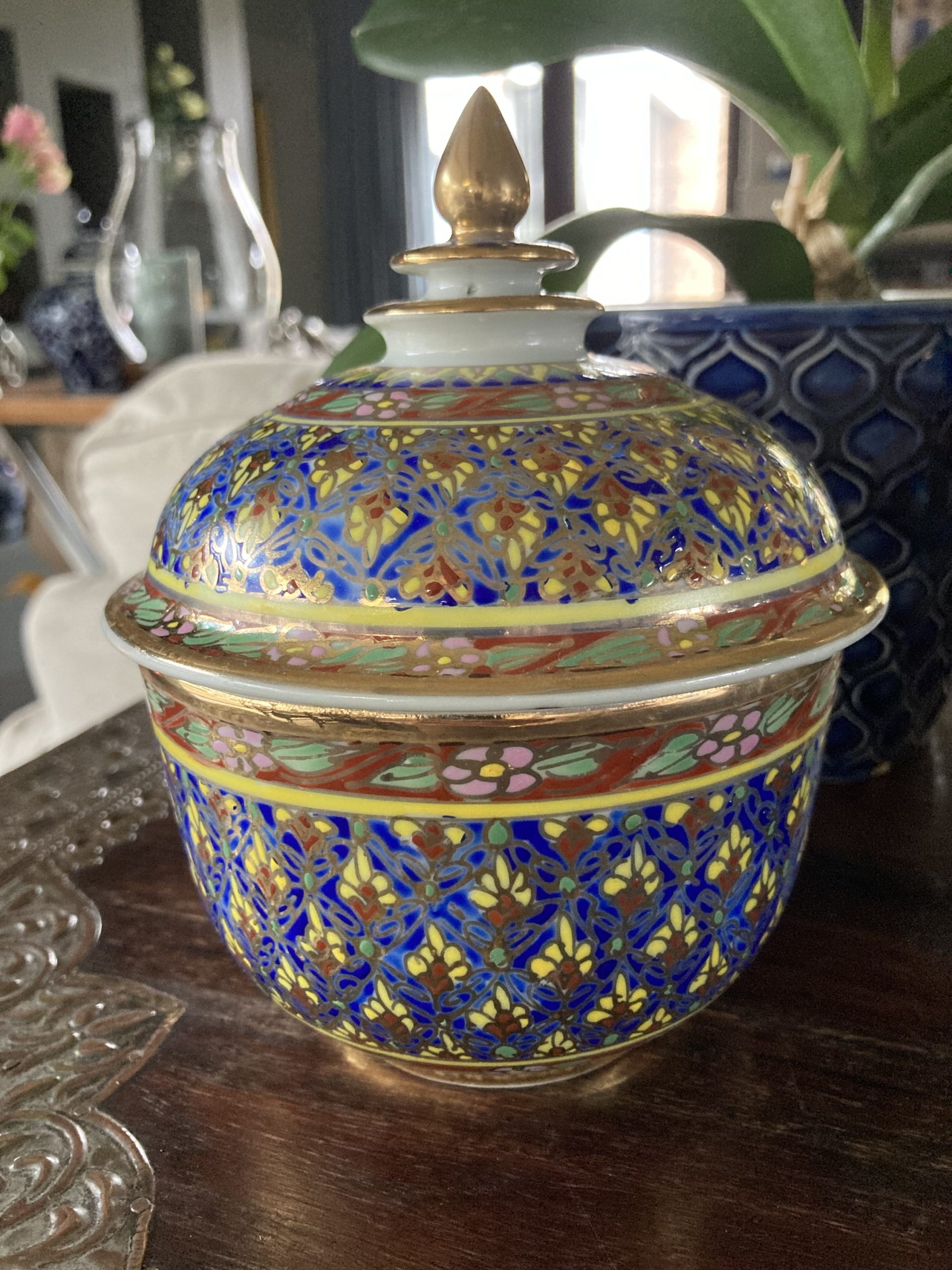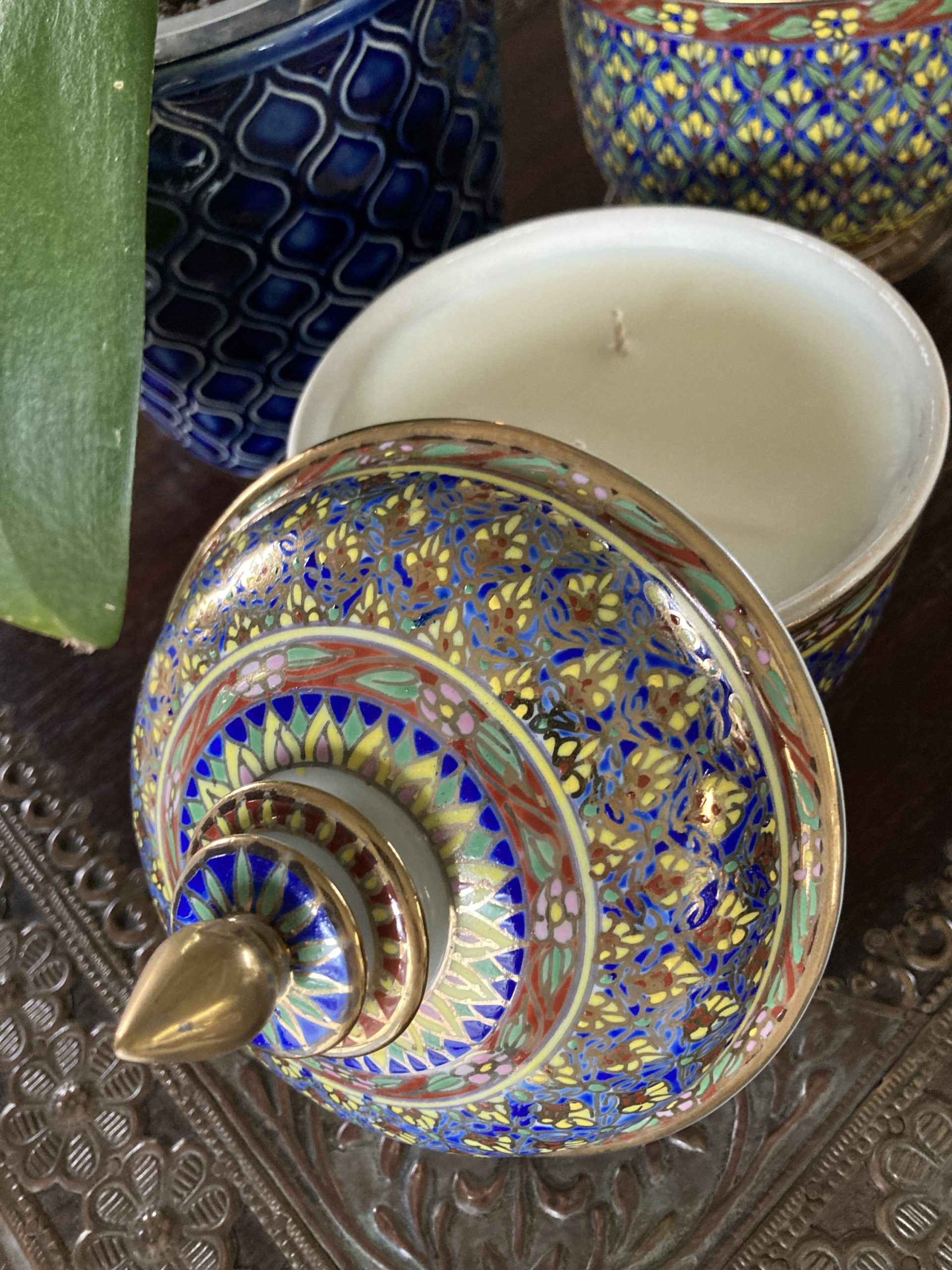 630gms pure soy wax hand poured into one of our exclusive range of handmade ceramics. This Benjarong pot is royal blue with green, yellow and gold accents and is 180mm high and 145mm wide.