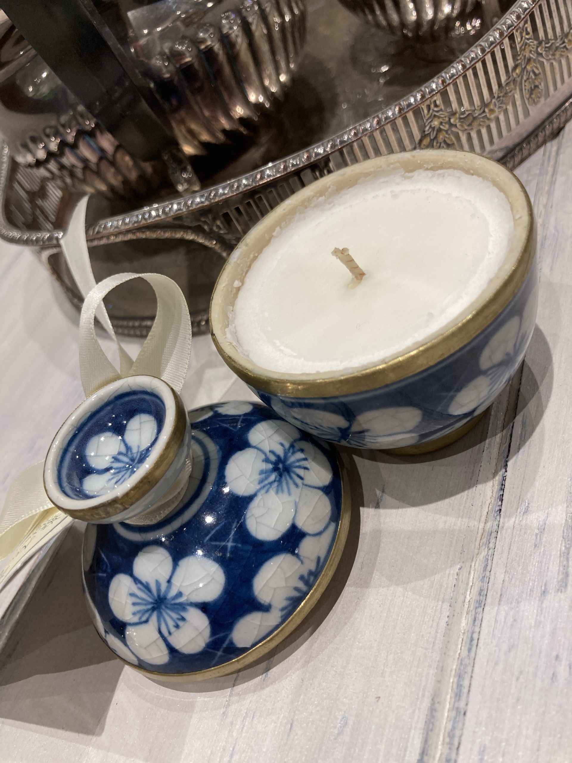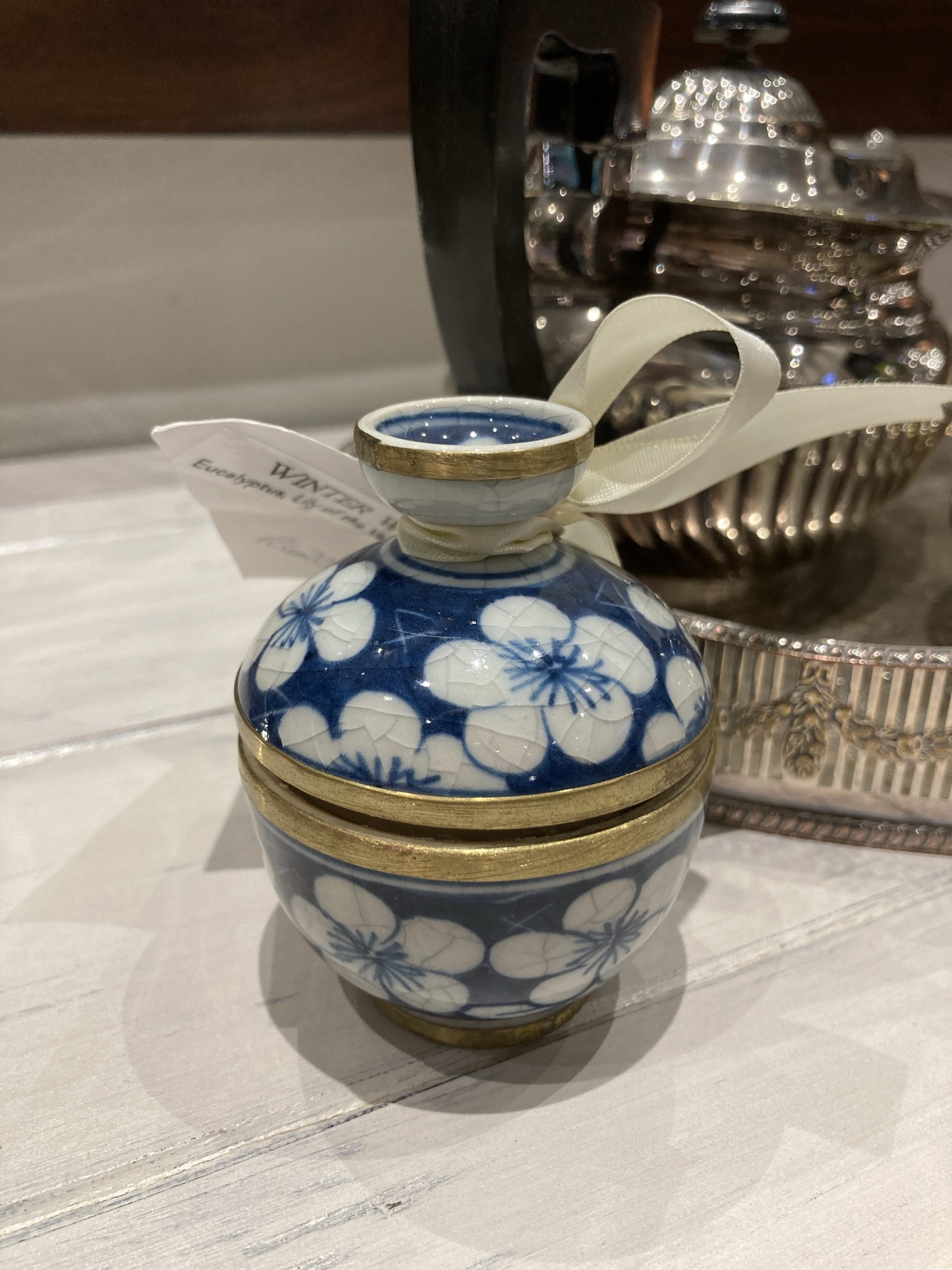 55gms pure soy wax hand poured into one of our exclusive range of handmade ceramics. This jar has a blue and white design with a metal trim and is 80mm high and 65mm wide.